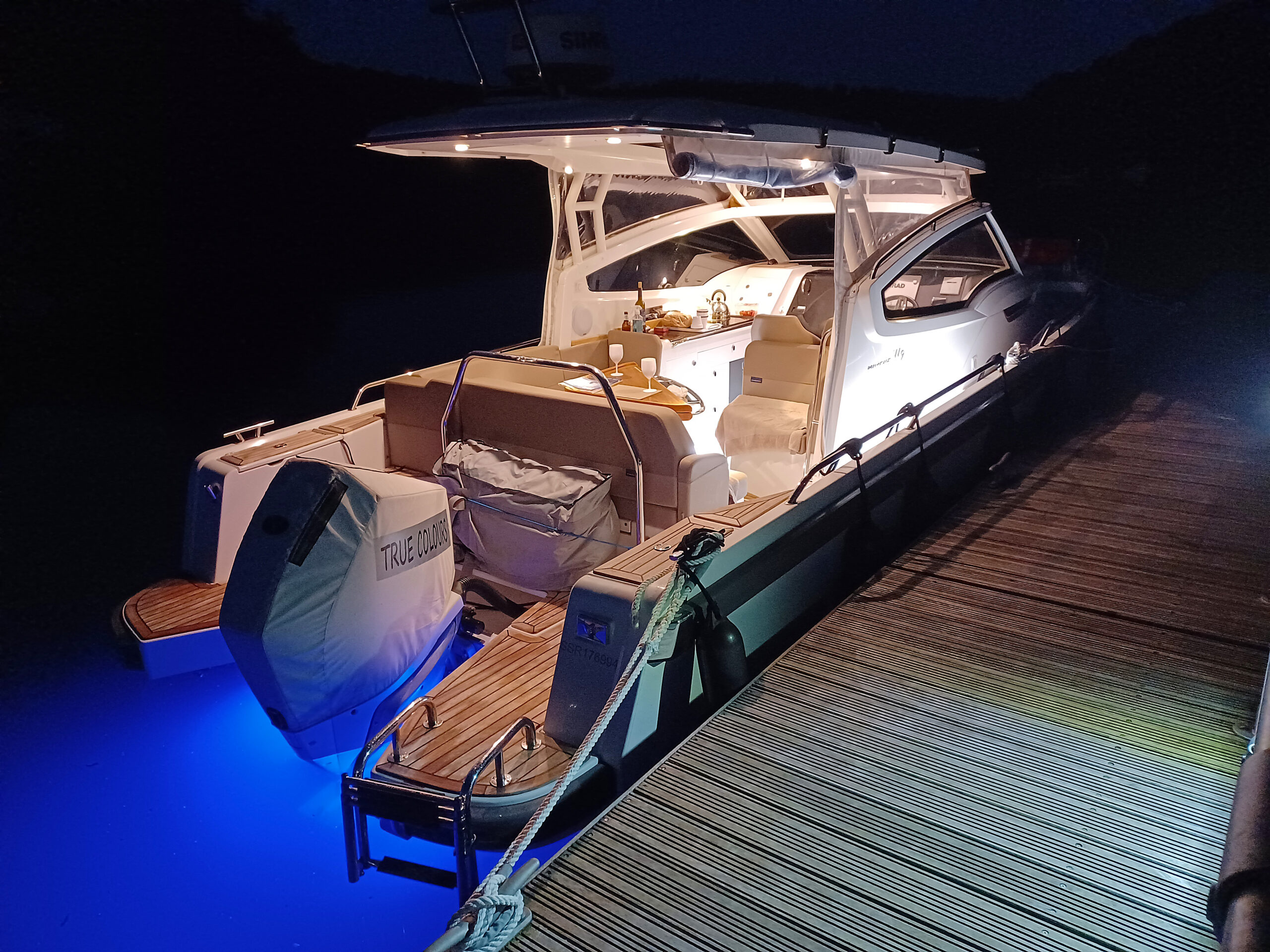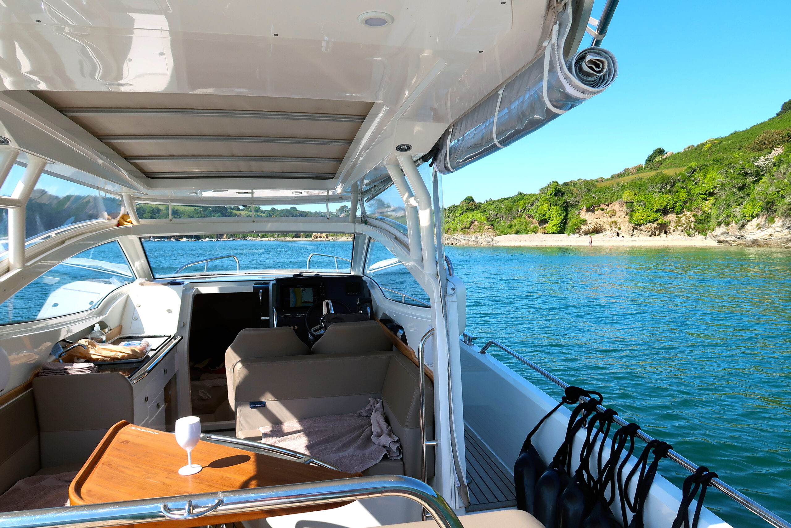 Sunbeds fore and aft, Cockpit table for lunch, Bluetooth sound system, Stay under the hard top,
